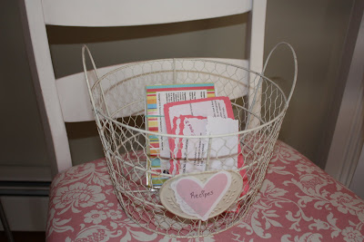 Along with the invitation, my mom sent a request to bring a recipe to the shower. Here is the basket where everyone placed their recipes! Hopefully, now I'll learn to cook... Oh, and the chair covers! Yeah, they were all re-covered to match the shower colors. Amazing...